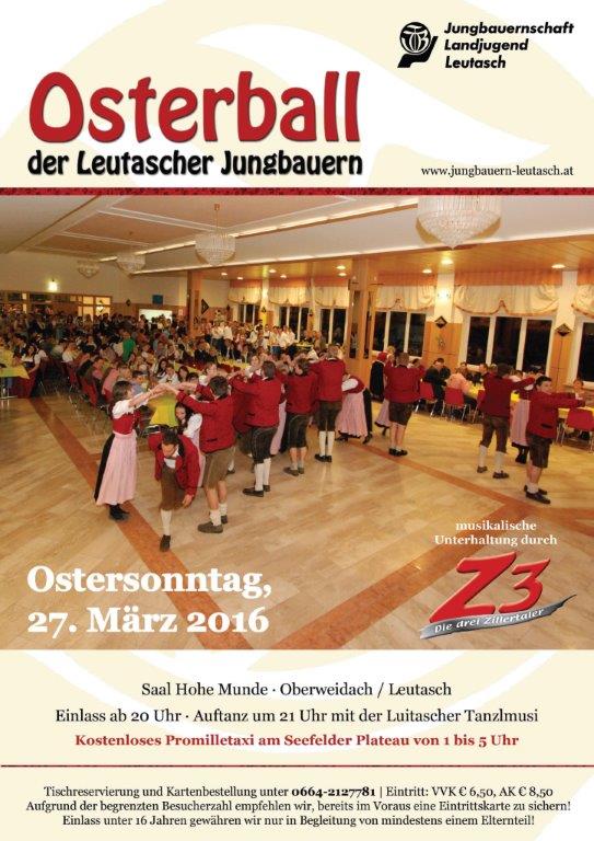 Es ist wieder so weit! Auch heuer findet der Osterball der Leutascher Jungbauern wieder am Ostersonntag, den 27. März 2016, statt. Wir freuen uns, euch ab 20 Uhr im Saal Hohe Munde in Oberweidach/Leutasch begrüßen zu dürfen, bevor wir um 21 Uhr mit dem traditionellen Auftanz der Vereinsmitglieder starten. Ganz besonders freut uns dabei, dass und hier die Luitascher Tanzlmusi musikalisch begleiten wird. Anschließend sorgen dieses Jahr die Männer von der Band Z3 für musikalische Unterhaltung. Als Neuheit dürfen wir euch heuer eine Cocktail-Bar vorstellen. Des Weiteren haben wir eine Selfie-Box für euch organisiert. Also schmeißt euch in eure Dirndln und Lederhosen und schaut vorbei.
